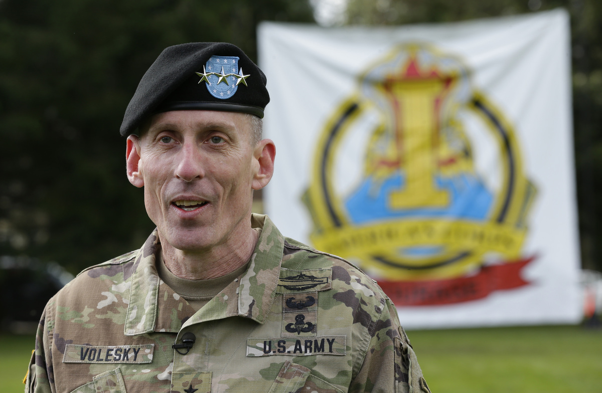 U.S. Army Lt. Gen. Gary Volesky talks to reporters following a change of command ceremony at Joint Base Lewis-McChord in Washington state on April 3, 2017. The Army has suspended Volesky over a recent tweet in response to the first lady.